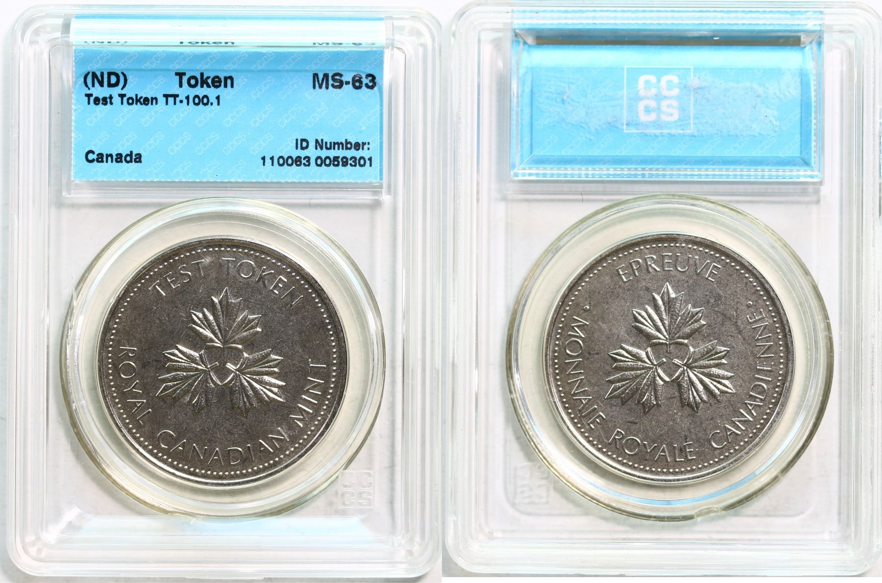 Test Token - TT-100.1 CCCS MS63. Test Token - Royal Canadian Mint. Copper nickel, 17,8 grams - 36,8 mm - Plain edge. Only known of this type.