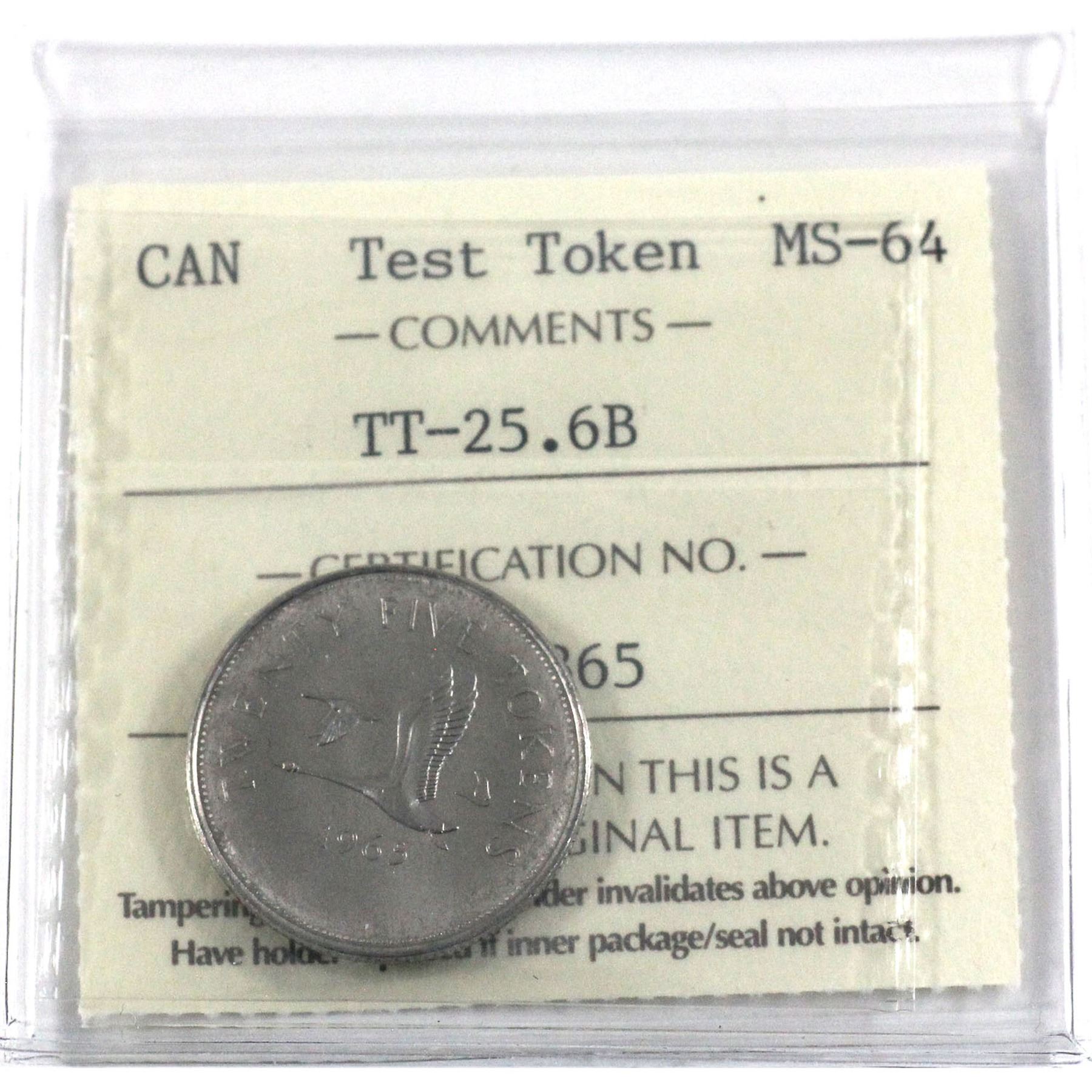 Test Token TT-25.6B, 25-cent 1965 ICCS Certified MS-64! A scarce token, originally produced by the RCM to provide an example of quality, and a piece for adjusting vending machines for nickel coins.