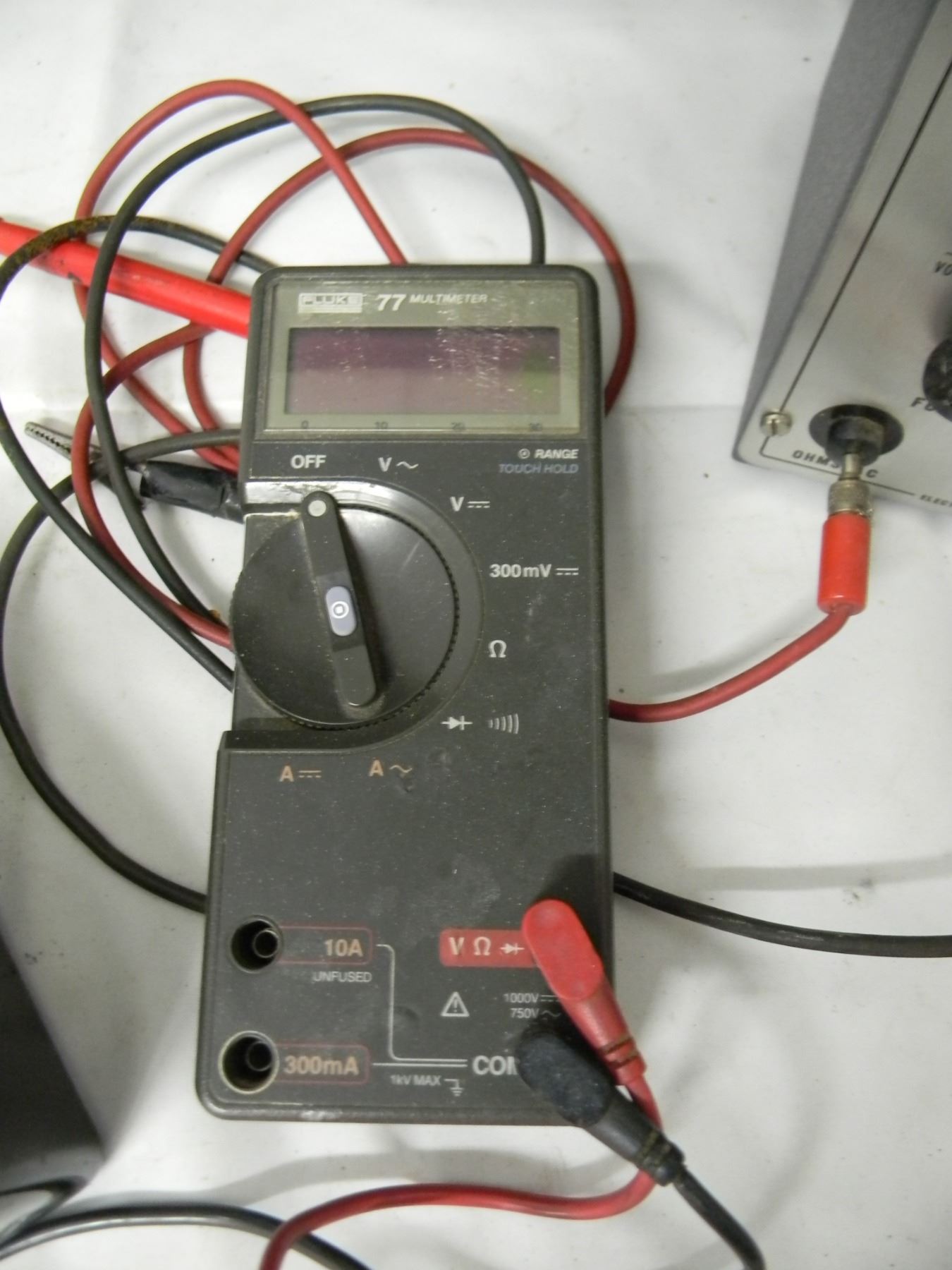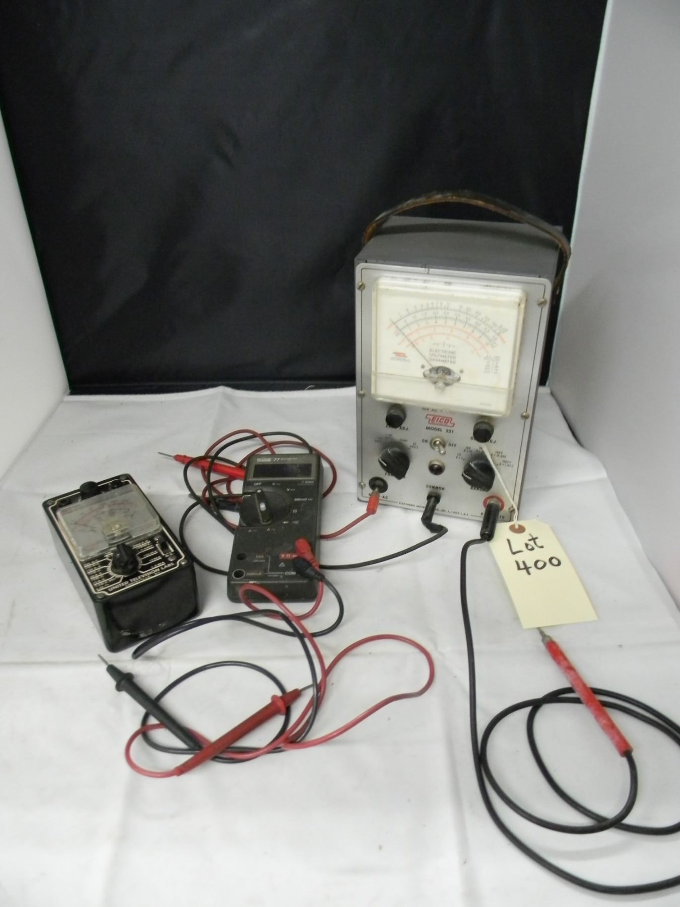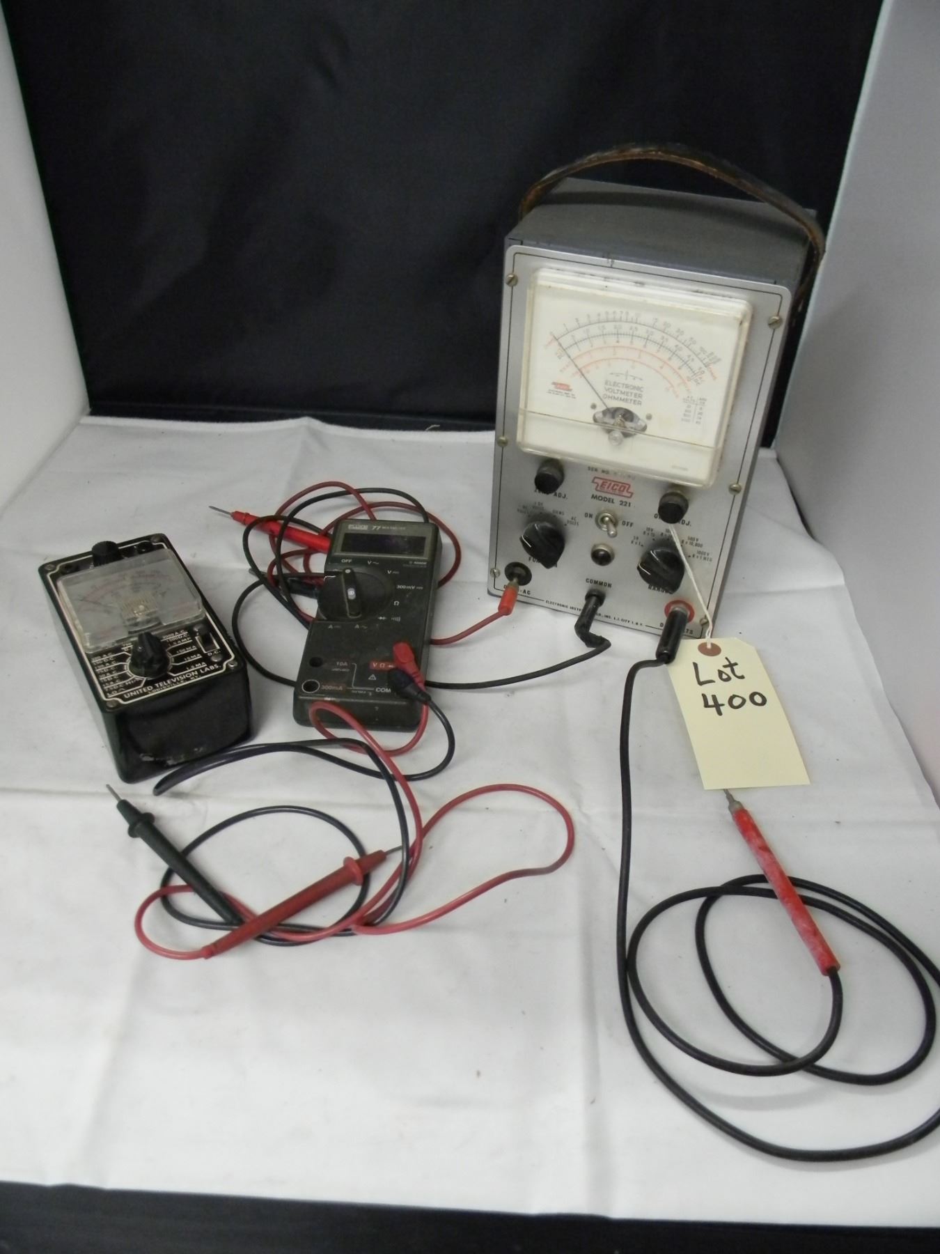 Eico voltmeter; model 221; with probes;; United Television Labs tester; model 770;; Fluke multimeter (works); model 77; with probes