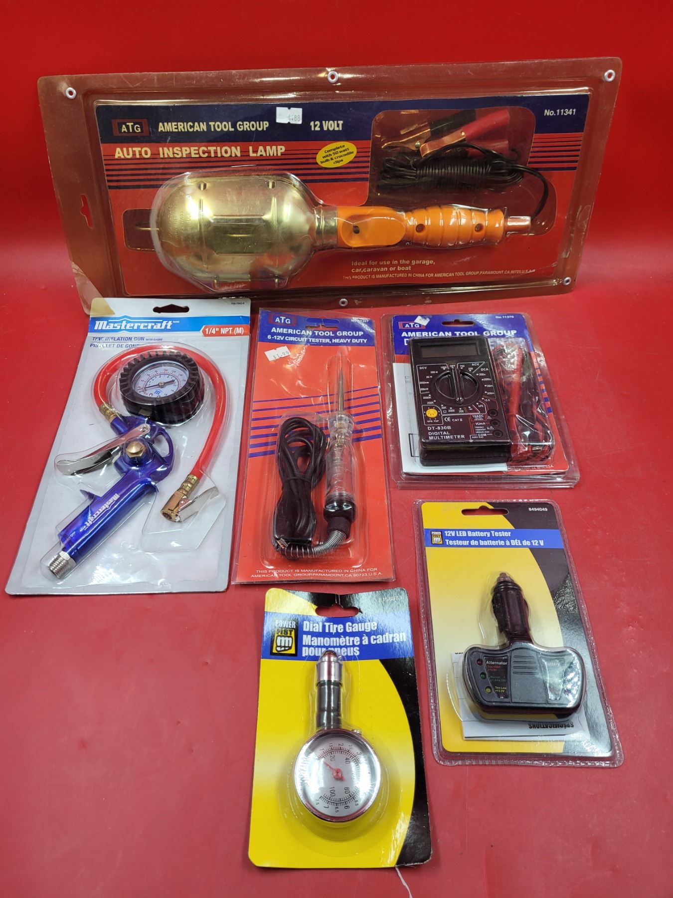 Testers (Circuit, Battery), Dial Tire Gauge, Tire Inflation Tool, Digital Multimeter, & Auto Inspection Lamp