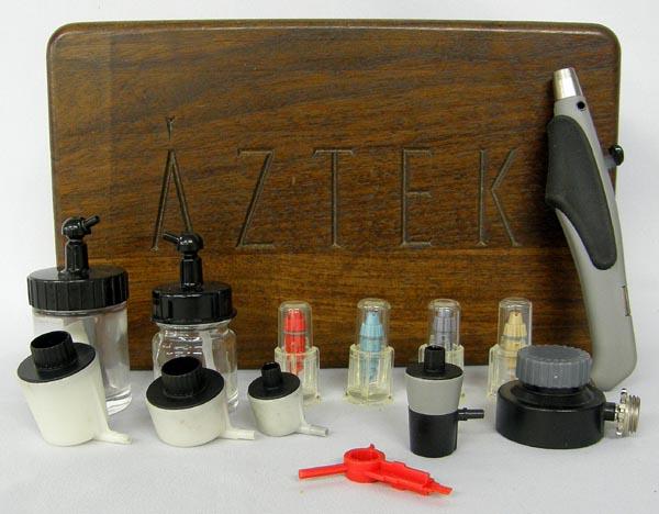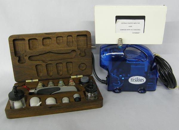 Testors ''Aztek'' Airbrush Set including Compressor in Wooden Box with Video. Box with tips measures approx. 9.5''Lx5.75''W, compressor is 6.5''Hx7''Lx3''W. Buyers Pay Actual Shipping and Handling Charges(see terms and conditions for more information).