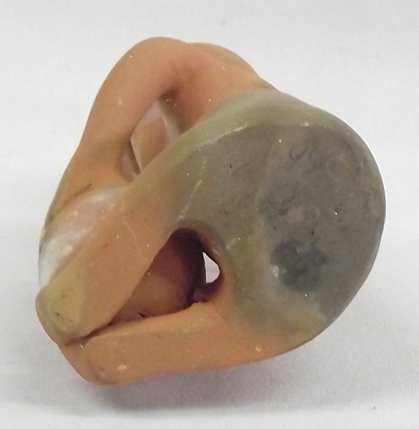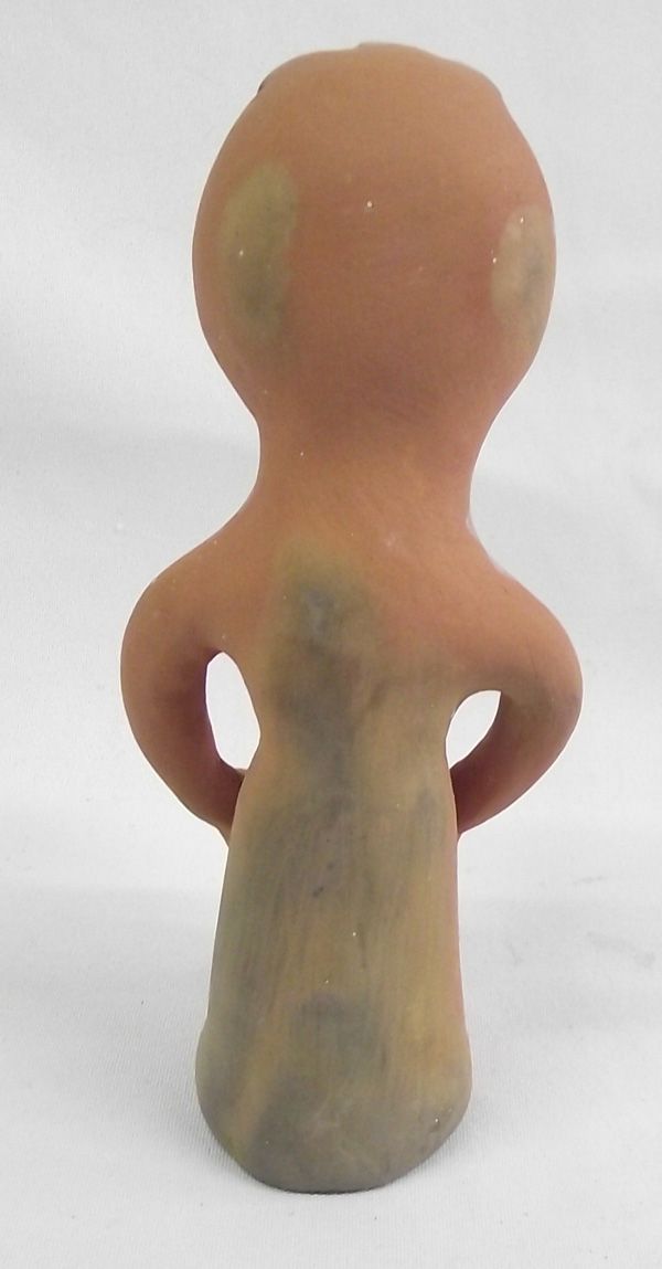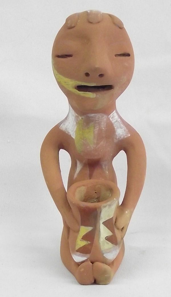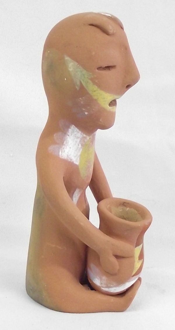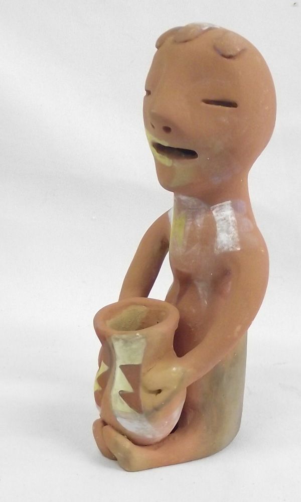 Tesuque Pottery Rain God Figure, measures 7.5''H x 3''W, terra cotta pottery accented with white--yellow--dark brown paint, figure is holding olla to collect rain water, Figurative pottery from New Mexico pueblo potters has a long tradition, at least as far back as 1880 or a little earlier. The earliest documented Rain God from Tesuque was collected in 1879