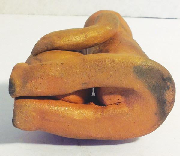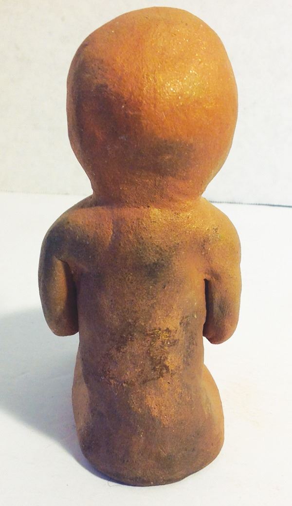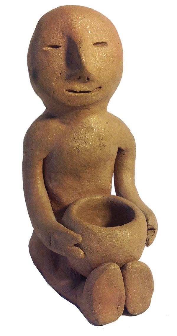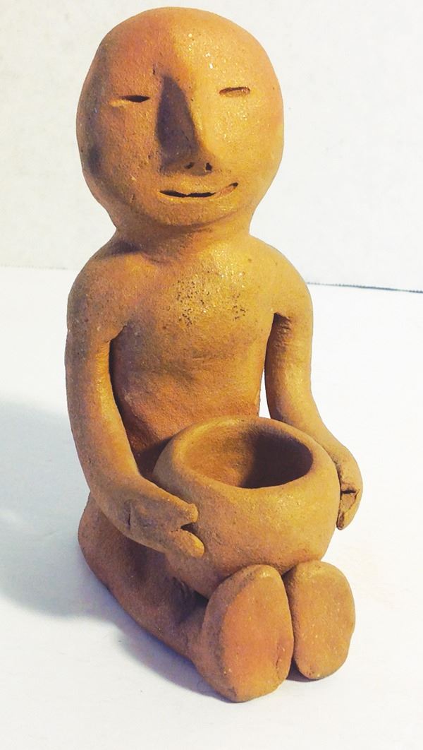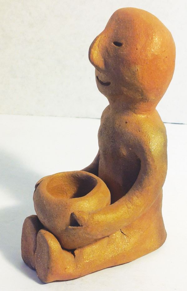 Traditional, formed mica clay figure shown seated and holding a pot for "catching rain." Very good condition.Mid 1900s6"