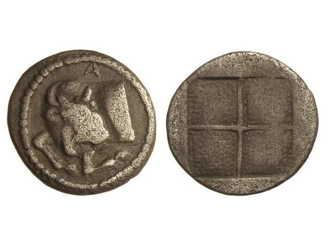 Tetróbolo. 424-380 a.C. AKANTOS. Anv.: Medio toro a izquierda con la cabeza vuelta a derecha, encima A. Rev.: Cuadro incuso dividido en cuatro partes. 1,80 grs. AR. Se-1369 var. MBC-.