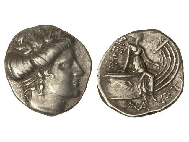 Tetróbolo. - S. III a.C. - HISTIAIA. - Anv.: Cabeza de la ninfa Histiaia a derecha. Rev.: La ninfa Histiaia sobre proa de nave, alrededor leyenda. 2,30 grs. AR. Se-2496 var. EBC. - -