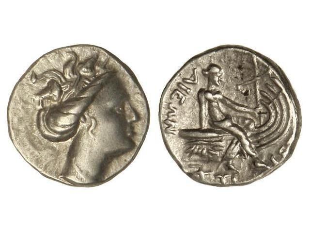 Tetróbolo. - S. III a.C. - HISTIAIA. - Anv.: Cabeza de la ninfa Histiaia a derecha. Rev.: La ninfa Histiaia sobre proa de nave, alrededor leyenda. 2,60 grs. AR. Se-2496 var. EBC. - -