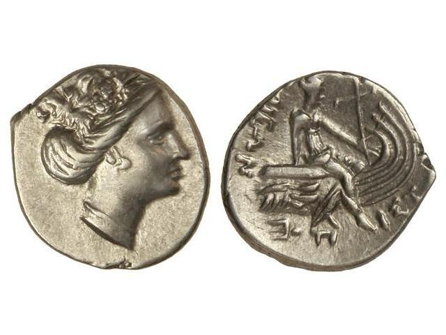 Tetróbolo. Siglo III a.C. HISTIAIA. Anv.: Cabeza de la ninfa Histiaia a derecha. Rev.: La ninfa Histiaia sobre proa de nave, alrededor leyenda. 2,50 grs. AR. Se-2496 var. EBC.