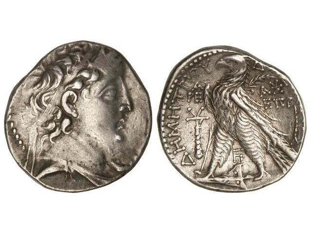 Tetradracma. 129-125 a.C. DEMETRIO II. NIKATOR. FENICIA. Anv.: Busto a derecha de Demetrio. Rev.: Águila, alrededor leyenda a la izquierda palmera. 14,30 grs. AR. Se-7105. MBC+/EBC.