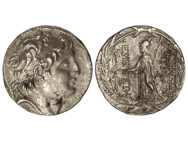 Tetradracma. 138-129 a.C. ANTÍOCO VII. REINO SELÉUCIDA. Anv.: Cabeza diademada a derecha. Rev.: Atenea en pie a izquierda con Victoria, delante y detrás leyenda alrededor de láurea. 16,46 grs. AR. (Pequeños golpecitos). Se-7091. MBC+.