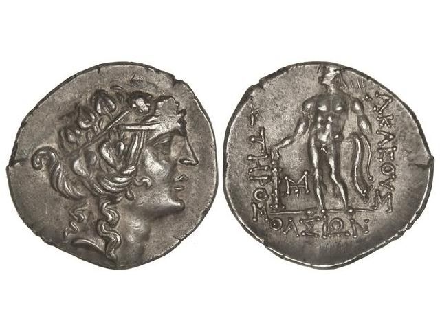 Tetradracma. 148 a.C. THASOS. Anv.: Cabeza joven de Dionisos a derecha. Rev.: Hércules desnudo en pie con maza y piel de león, alrededor leyenda y monograma. 16,79 grs. AR. CY-1530. EBC.