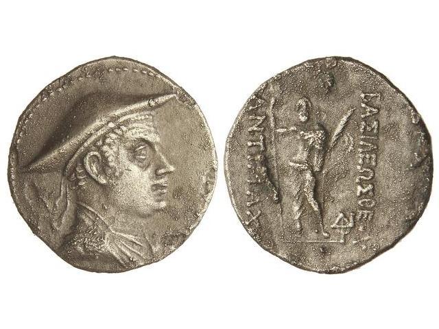Tetradracma. 171-160 a.C. ANTIMACOS. BACTRIA E INDOGRECIA. Anv.: Busto a derecha. Rev.: Poseidón de frente con tridente y hoja de palma. 15,53 grs. (Oxidaciones y concreciones). Se-7542. MBC+/MBC.