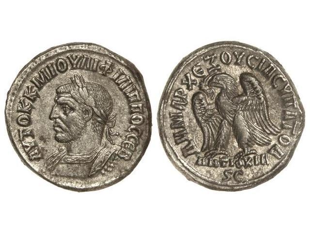 Tetradracma. 244-249 d.C. FILIPO I. ANTIOQUÍA. Anv.: Busto laureado a izquierda, alrededor leyenda. Rev.: Águila a izquierda, alrededor leyenda. 12,70 grs. GIC-No cat. EBC-/EBC.