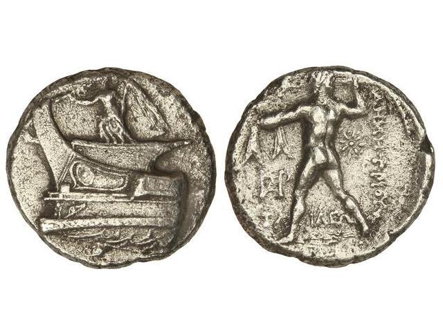 Tetradracma. 294-288 a.C. DEMETRIO POLIORKETES. Anv.: Nike en pie sobre proa de galera a izquierda. Rev.: Poseidón con tridente a izquierda, detrás leyenda y símbolo, delante monograma, debajo leyenda. 15,90 grs. AR. (Oxidaciones). Se
