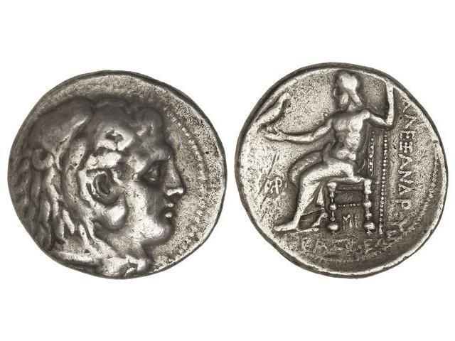 Tetradracma. 300-280 a.C. ALEJANDRO MAGNO. Anv.: Cabeza de Hércules con piel de león a derecha. Rev.: Zeus entronizado a izquierda, detrás y debajo leyenda. 16,63 grs. (Leves rayitas y leves golpecitos). CY-1314. MBC.