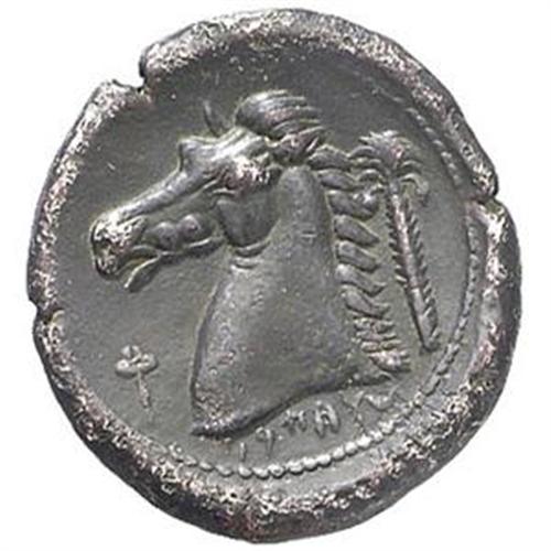 Mondo Greco. Sicilia Punica. Tetradracma, 325-300 a.C. D/ Testa di giovane Eracle a destra. R/ Testa di cavallo a sinistra. Dietro, albero di palma. Davanti, caduceo. Sotto, legenda punica. Cfr. Muller II, 76, 21. gr. 16.75 AG. qSPL. Esemplare perfettamente centrato, con patina di monetiere.