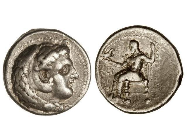 Tetradracma. 336-323 a.C. ALEJANDRO MAGNO. Anv.: Cabeza de Hércules con piel de león a derecha. Rev.: Zeus entronizado a izquierda, detrás leyenda, delante símbolo. 17,10 grs. AR. Se-6718 var. MBC.