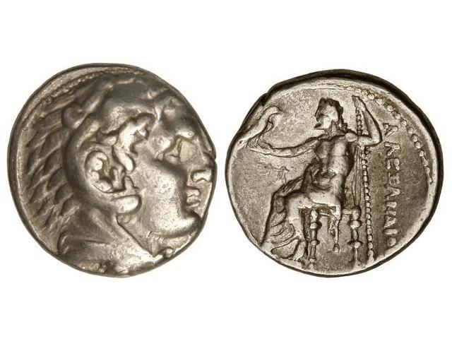 Tetradracma. 336-323 a.C. ALEJANDRO MAGNO. Anv.: Cabeza de Hércules con piel de león a derecha. Rev.: Zeus entronizado a izquierda, delante y debajo de la silla símbolo, detrás leyenda. 17,10 grs. AR. (Busto de Hércules ligeramente recortado). Se-6721 var. EBC-.