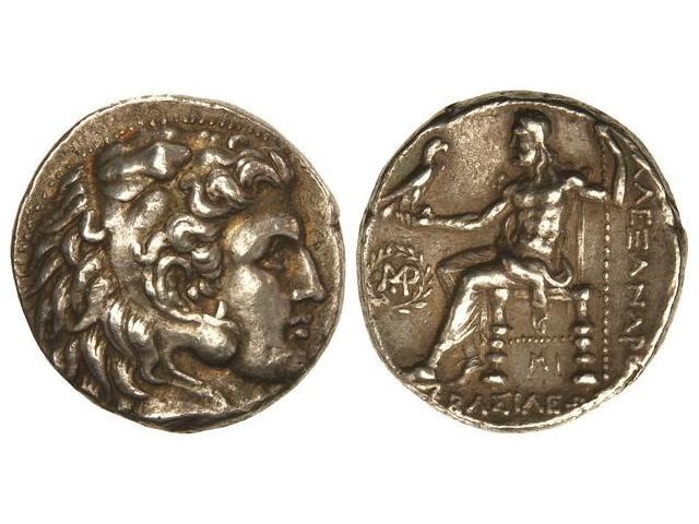 Tetradracma. - 336-323 a.C. - ALEJANDRO MAGNO. - MACEDONIA, TRACIA y THESALIA. - Anv.: Cabeza de Hércules con piel de león a derecha. Rev.: Zeus entronizado a izquierda, alrededor leyenda y monogramas. 17 grs. AR. Pátina. Müller-734. EBC. - -