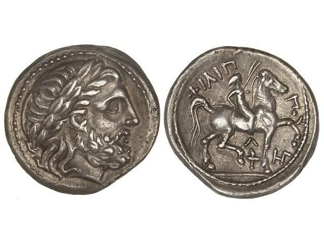 Tetradracma. 356-336 a.C. FILIPO II. ANFÍPOLIS. Anv.: Cabeza de Zeus laureado a derecha. Rev.: Jinete a derecha, debajo antorcha y detrás ¶y HE¶en monograma. 14,27 grs. AR. Bonita pátina. CY-1212 var. EBC.