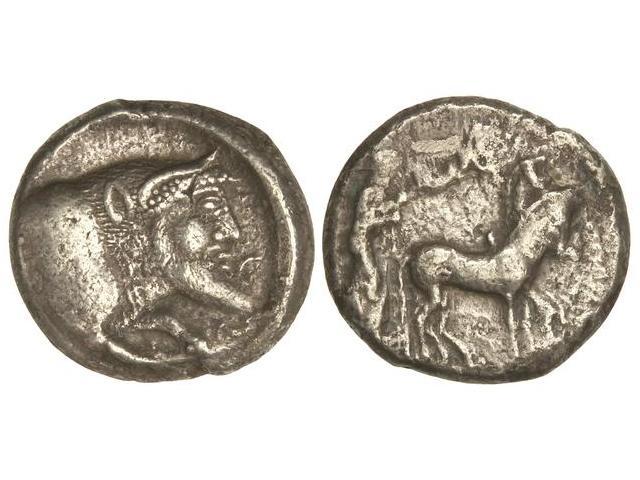 Tetradracma. 430-425 a.C. GELA. Anv.: Cuadriga a derecha, Nike encima volando. Rev.: Mitad de toro androcéfalo a derecha. 16,80 grs. AR. Se-792. MBC+/MBC-.