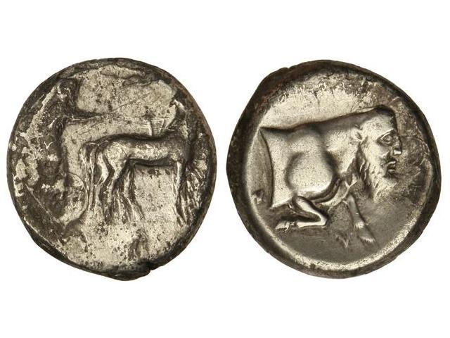 Tetradracma. - 430-425 a.C. - GELA. - Anv.: Cuadriga a derecha, Nike encima volando. Rev.: Mitad de toro androcéfalo a derecha. 16,60 grs. AR. (Oxidaciones). Se-792. MBC-/MBC. - -