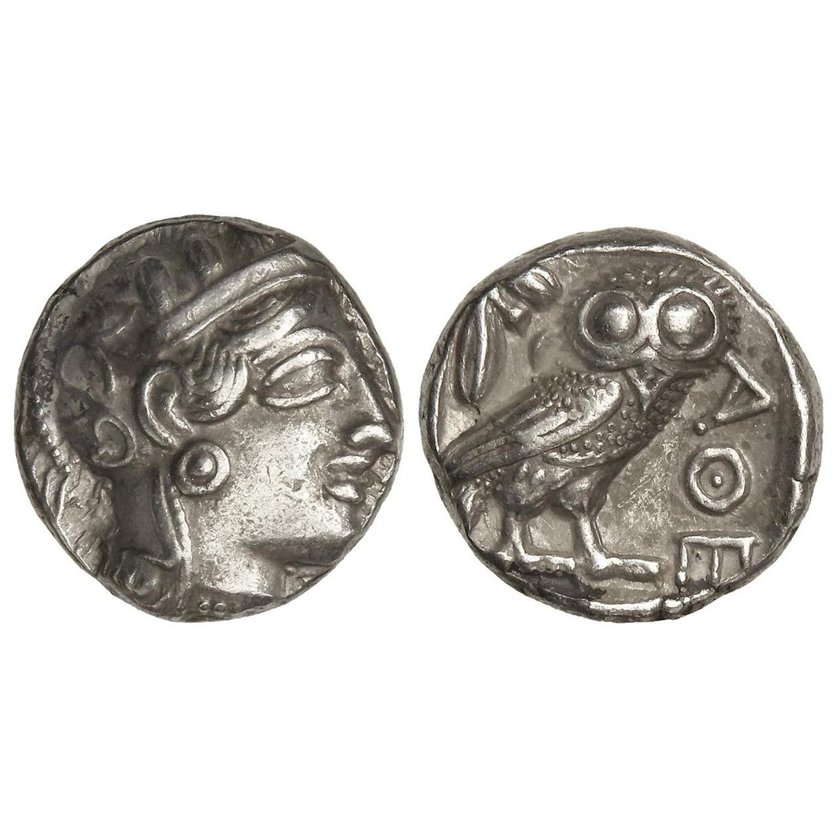 Tetradracma. - 449-413 a.C. - ATENAS. - Anv.: Cabeza de Atenea con casco a derecha. Rev.: Lechuza en pie a derecha, delante A¶E, detrás rama de olivo y creciente. 17,13 grs. AR. Se-2526. EBC-. - -