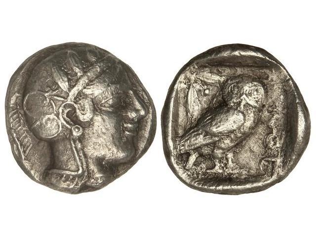 Tetradracma. 465-460 a.C. ATENAS. Anv.: Busto de Atenea a derecha. Rev.: Lechuza en pie de frente, detrás rama de olivo. 16,90 grs. AR. Variante sin creciente. (Oxidaciones limpiadas). Se-2519 sim. MBC-.