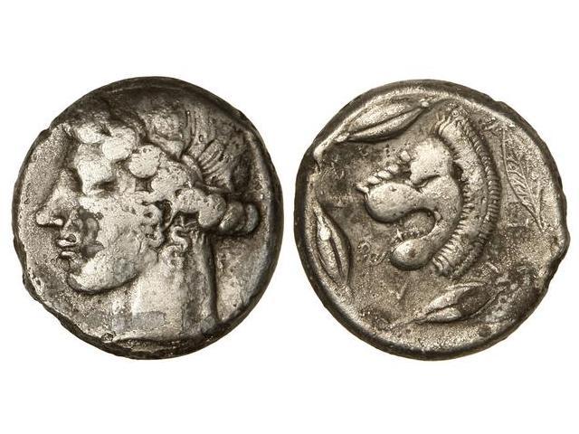 Tetradracma. 466-425 a.C. LEONTINOI. Anv.: Busto de Apolo a izquierda. Rev.: Cabeza de león, alrededor cuatro granos de trigo. 16,10 grs. AR. (Oxidaciones). Se-833. MBC.