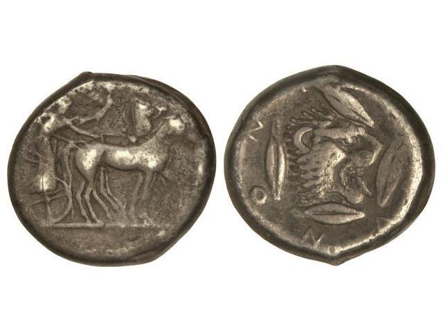 Tetradracma. - 475-466 a.C. - LEONTINI. - Anv.: Cuadriga a derecha encima Nike. Rev.: Cabeza de león a derecha, alrededor cuatro granos de cebada y leyenda. 16,70 grs. AR. Se-825 var. MBC/MBC-. - -
