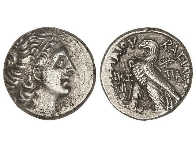 Tetradracma. 55-51 a.C. PTOLOMEO XII segundo reinado. REINO PTOLEMAICO DE EGIPTO. Anv.: Cabeza diademada a derecha. Rev.: Águila en pie a izquierda, detrás palma, alrededor leyenda y monogramas. 13,58 grs. Se-7947 sim. MBC+.