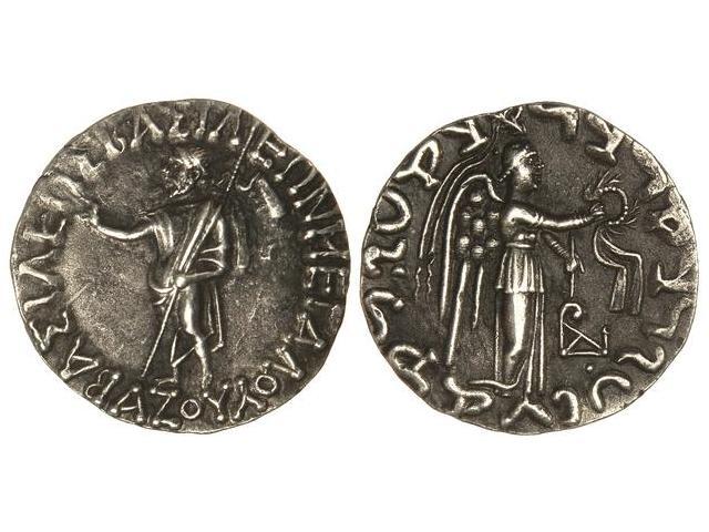 Tetradracma. 58-12 a.C. AZES. INDO ESCITAS DEL PAKISTÁN. Anv.: Zeus en pie portando torque y cetro. Rev.: Nike en pie a derecha con corona con ribetes, alrededor leyenda karostí: NAHARAJASA RAJARAJASA MAHATASA AYASA. 9,50 grs.