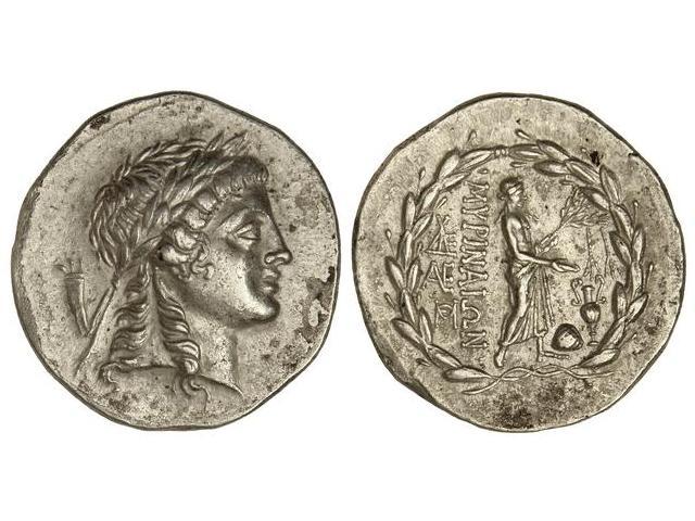 Tetradracma. Siglo II a.C. MYRINA. Anv.: Cabeza laureada de Apolo a derecha. Rev.: Apolo a derecha con pátera y rama de laurel, a sus pies ónfalos y ánfora dentro de láurea. 16,70 grs. AR. Se-4216. EBC-.