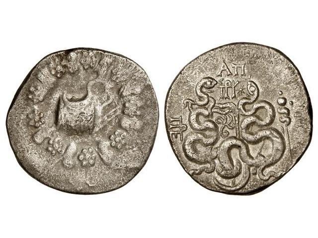 Tetradracma cistofórico. 133 a.C. PÉRGAMO. Anv.: Cista mística. Rev.: Arco carcaj entre serpientes. 11,82 grs. AR. Se-3948. MBC-/MBC.