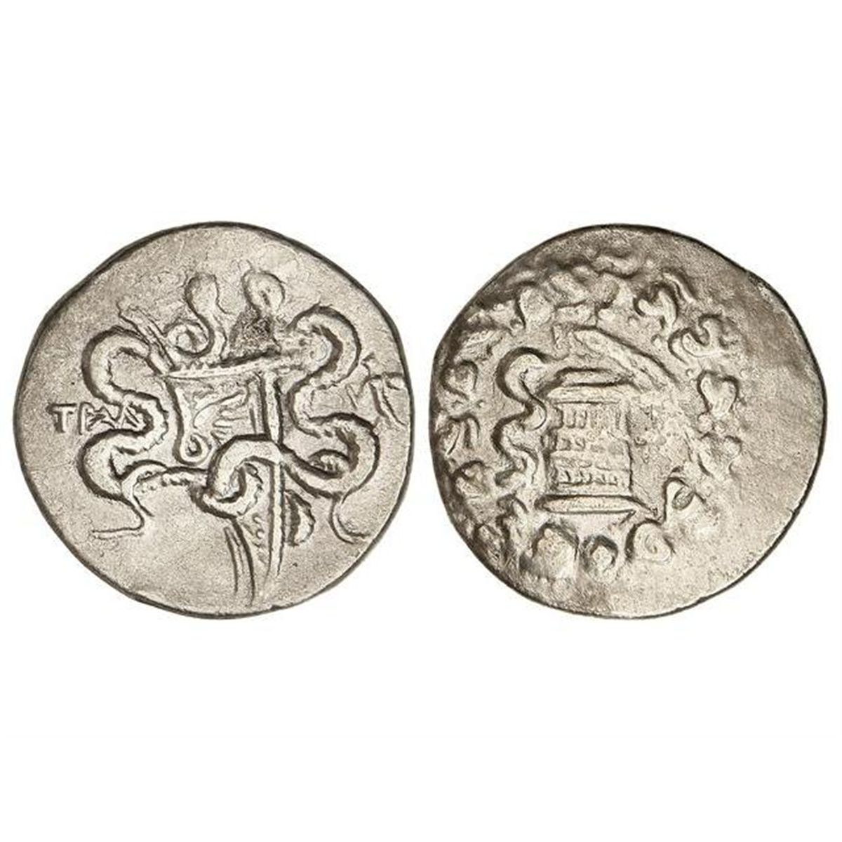 Tetradracma cistofórico. - 189-133 a.C. - LIDIA. - TRALLEIS. - Anv.: Serpiente saliendo de cista mística, todo en guirlanda. Rev.: Arco enfundado entre dos serpientes enrolladas. 12,33 grs. AR. (Pequeños golpecitos). Se-4745 Sim. MBC. - -