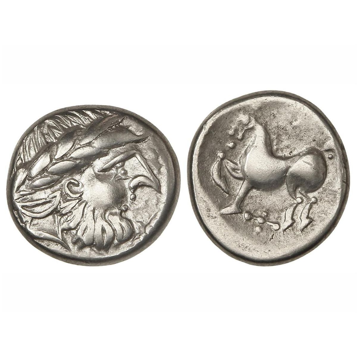 Tetradracma de imitación de Filipo II. - Siglo II a.C. - CELTAS DEL DANUBIO. - Anv.: Cabeza tosca a derecha. Rev.: Caballo a izquierda. 11,91 grs. AR. GIC-No cat. EBC-/MBC+. - -
