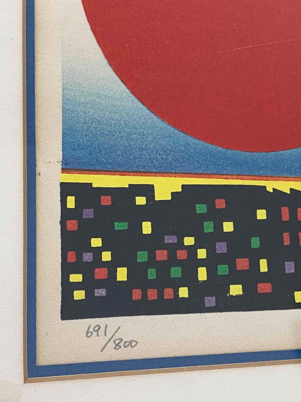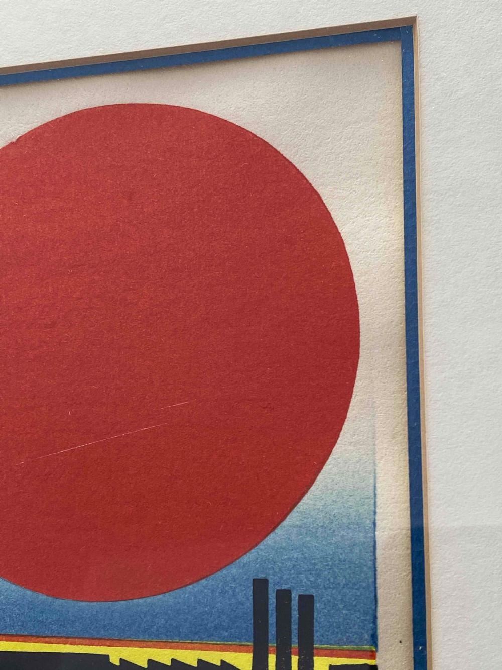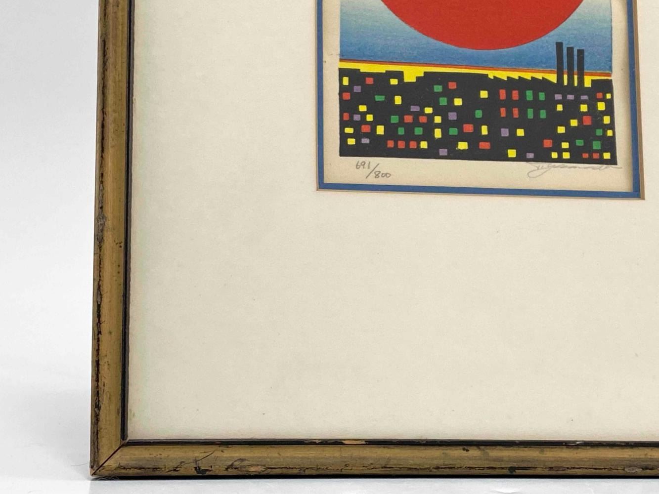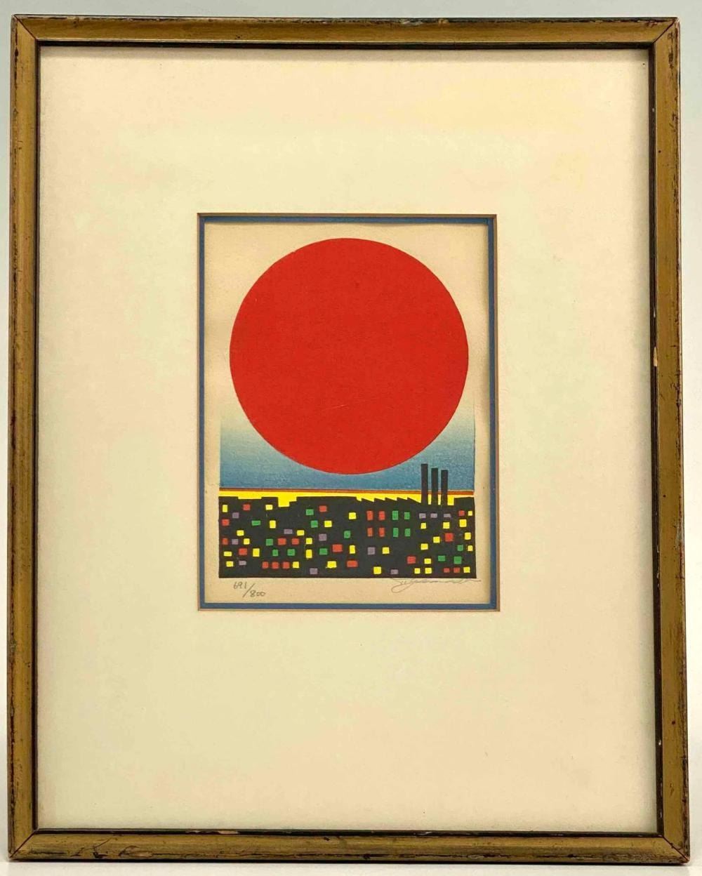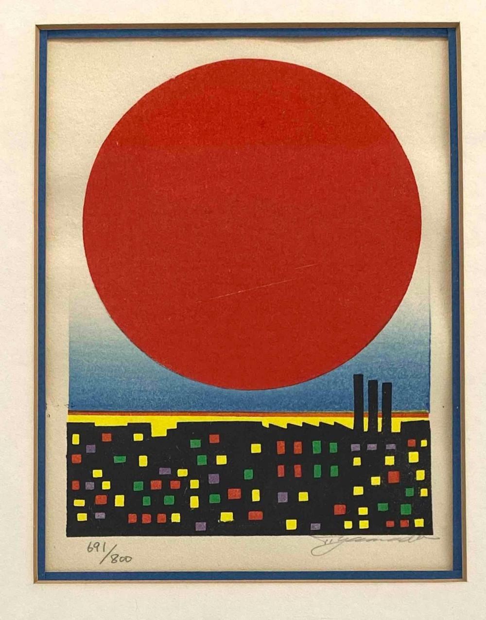 Tetsuo Yamada, Red Sun Rising Over a Cityscape, Japanese Ukiyo-e Woodblock Print on Paper. Excellent Japanese Modernist Woodblock of an Urban Landscape. Signed T. Yamada 691/800. Attached Tag Reads Kabutoya Galleries, Artist T. Yamada, Title The Sun, Medium Woodblock Print. Approximately 17.75L x 11.75W in. Sight Approximately 6.75L x 5.0W in.