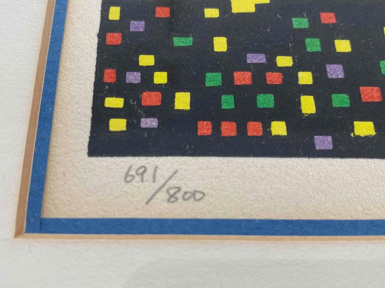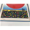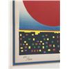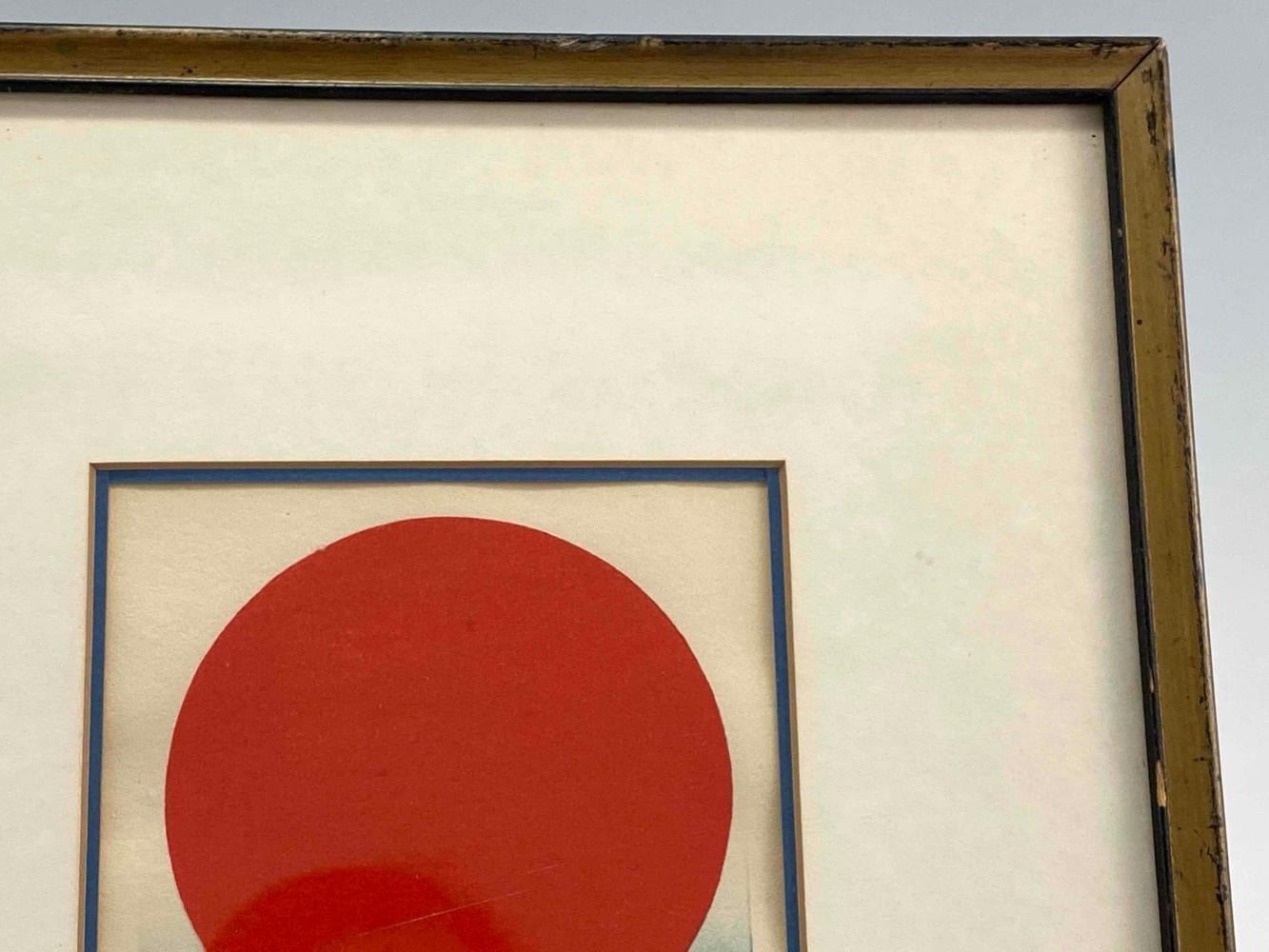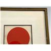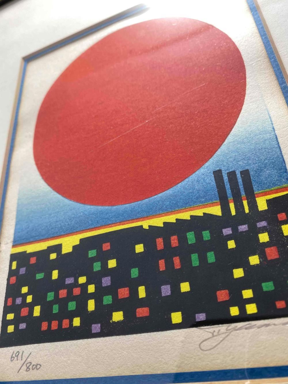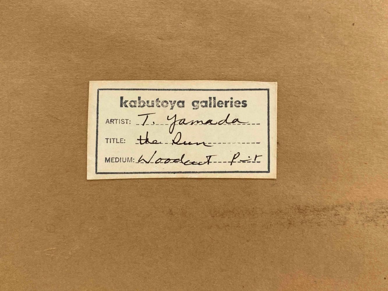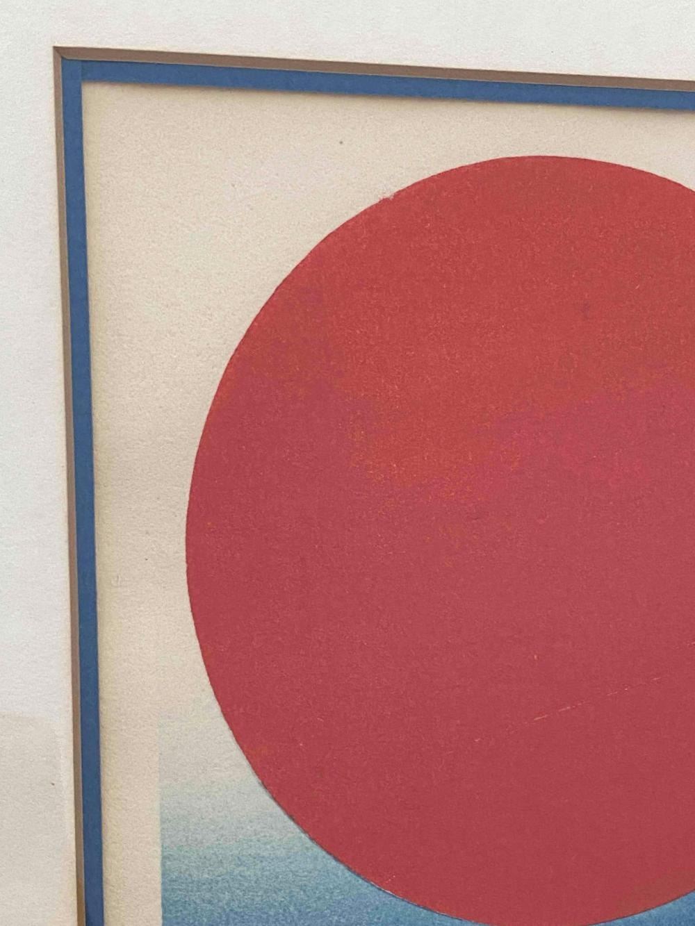 Tetsuo Yamada, Red Sun Rising Over a Cityscape, Japanese Ukiyo-e Woodblock Print on Paper. Excellent Japanese Modernist Woodblock of an Urban Landscape. Signed T. Yamada 691/800. Attached Tag Reads Kabutoya Galleries, Artist T. Yamada, Title The Sun, Medium Woodblock Print. Approximately 17.75L x 11.75W in. Sight Approximately 6.75L x 5.0W in.