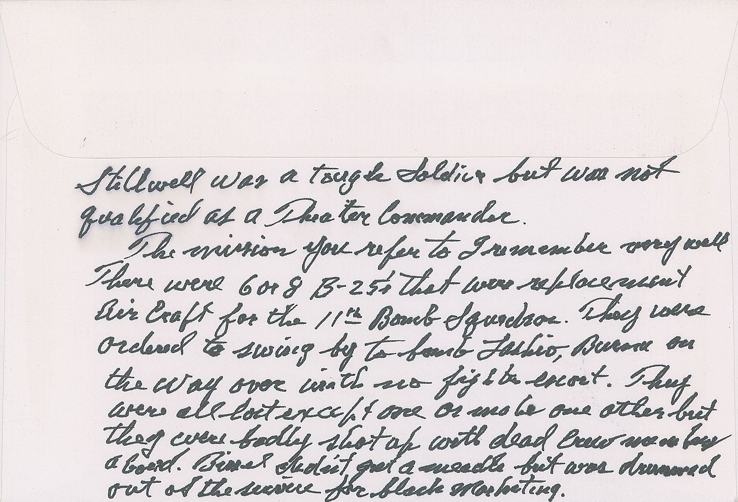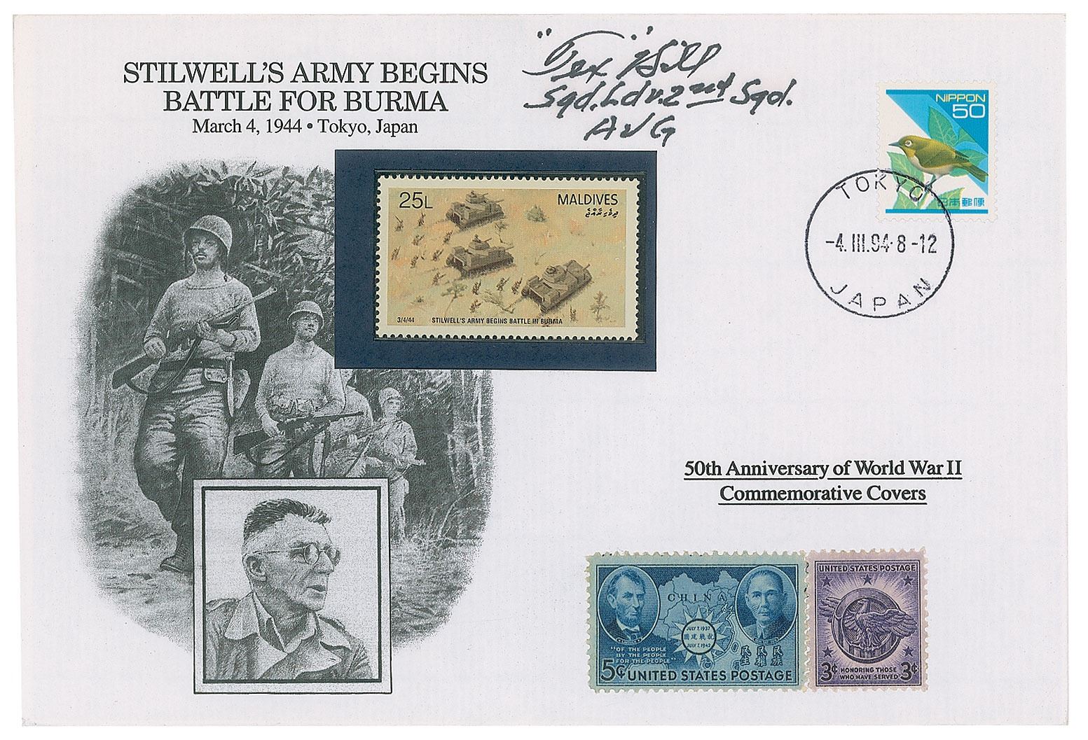 Very appealing 50th Anniversary of World War II commemorative cover, 7.5 x 5, with a cachet honoring 'Stilwell's Army Begins Battle for Burma,' signed in black ink, "'Tex' Hill, Sqd. Ldr. 2nd Sqd., AVG," with Hill adding a lengthy critique of Stilwell on the reverse: "Stilwell was a tough soldier but was not qualified as a Theater Commander. The mission you refer to I remember very well. There were 6 or 8 B-25's that were replacement aircraft for the 11th Bomb Squadron. They were ordered to swing by to bomb Lashio, Burma on the way over with no fighter escort. They were all lost except one or maybe one other but they were badly shot up with dead crew members aboard. Bissel didn't get a medal but was drummed out of the service for black marketing." In fine condition.