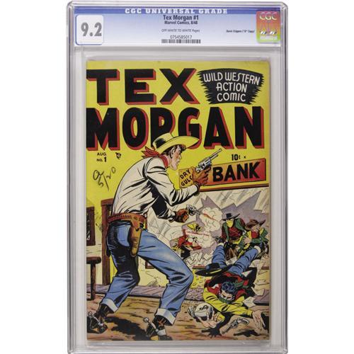 <B>Tex Morgan #1 Davis Crippen ("D" Copy) pedigree (Marvel, 1948) CGC NM- 9.2 Off-white to white pages.</B></I> This issue marked the first appearance of the title character. By the way, the similarity in name to Rex Morgan may be a coincidence, as the comic-strip sawbones also debuted in the summer of 1948! Overstreet 2006 NM- 9.2 value = $330. CGC census 10/06: 1 in 9.2, 2 higher. <I>From the Crippen Collection.</B></I><BR><BR><b>Shipping:</b> Slabbed Comic (<a target="_blank" href="http://www.heritageauctions.com/common/shipping.php">view shipping information</a>)