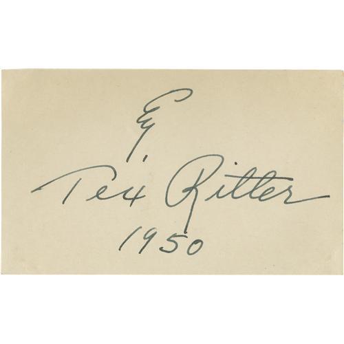 <B>Tex Ritter Autograph.</B></I> A 3" x 5" notecard signed and dated 1950 by the singer and actor in black ink, in Very Fine condition with moderate tanning.<BR><BR><b>Shipping:</b> Flat Material, Small (<a target="_blank" href="http://www.heritageauctions.com/common/shipping.php">view shipping information</a>) <BR><BR><B>Important