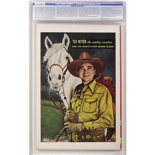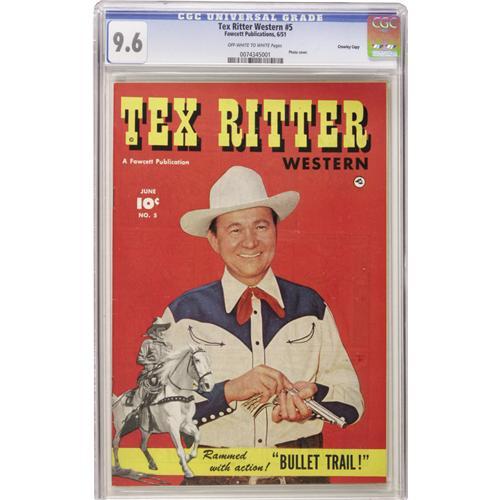<B>Tex Ritter Western #5 Crowley Copy pedigree (Fawcett, 1951) CGC NM+ 9.6 Off-white to white pages.</B></I> Photo cover. Last issue with a back cover photo pin-up. Only CGC-graded copy to date. Overstreet 2006 NM- 9.2 value = $290. CGC census 10/06: 1 in 9.6, none higher.<BR><BR><b>Shipping:</b> Slabbed Comic (<a target="_blank" href="http://www.heritageauctions.com/common/shipping.php">view shipping information</a>)