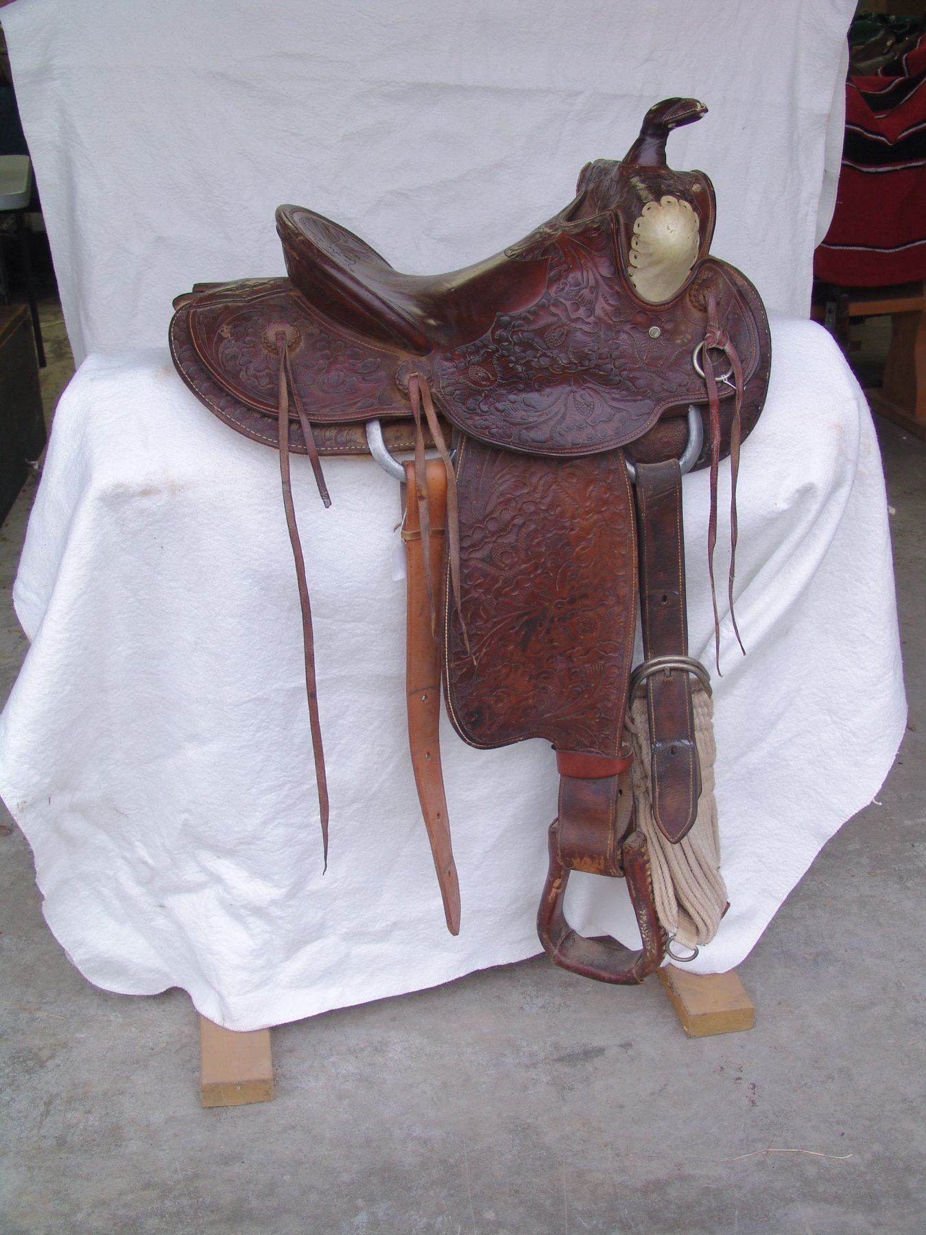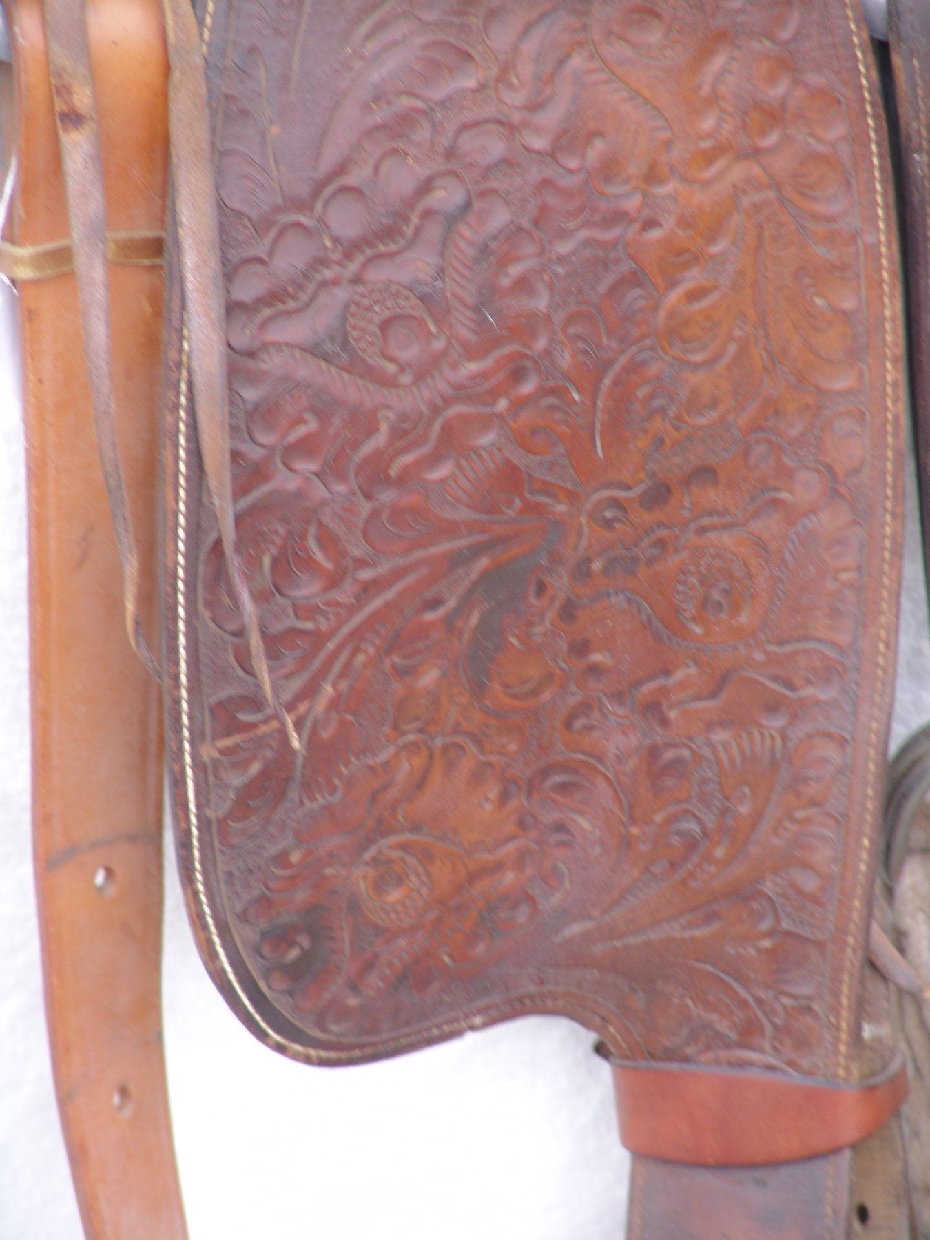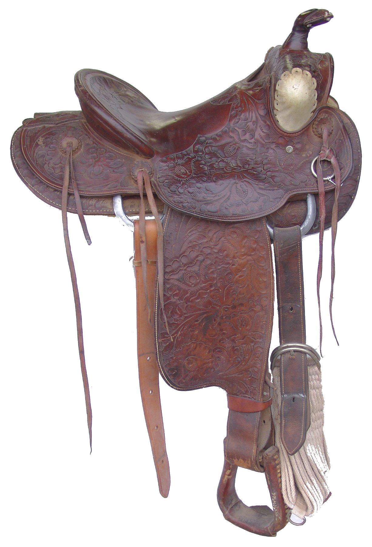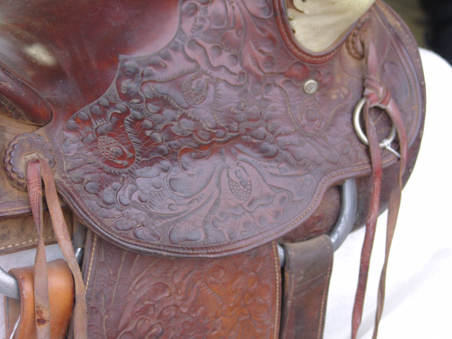 Mid 1900s Adult Vintage, fancy, fully tooled western saddle marked "Tex Tan Brahma Brand - 101+", with 14" seat. Good condition, torn out rope strap, needs oiled.