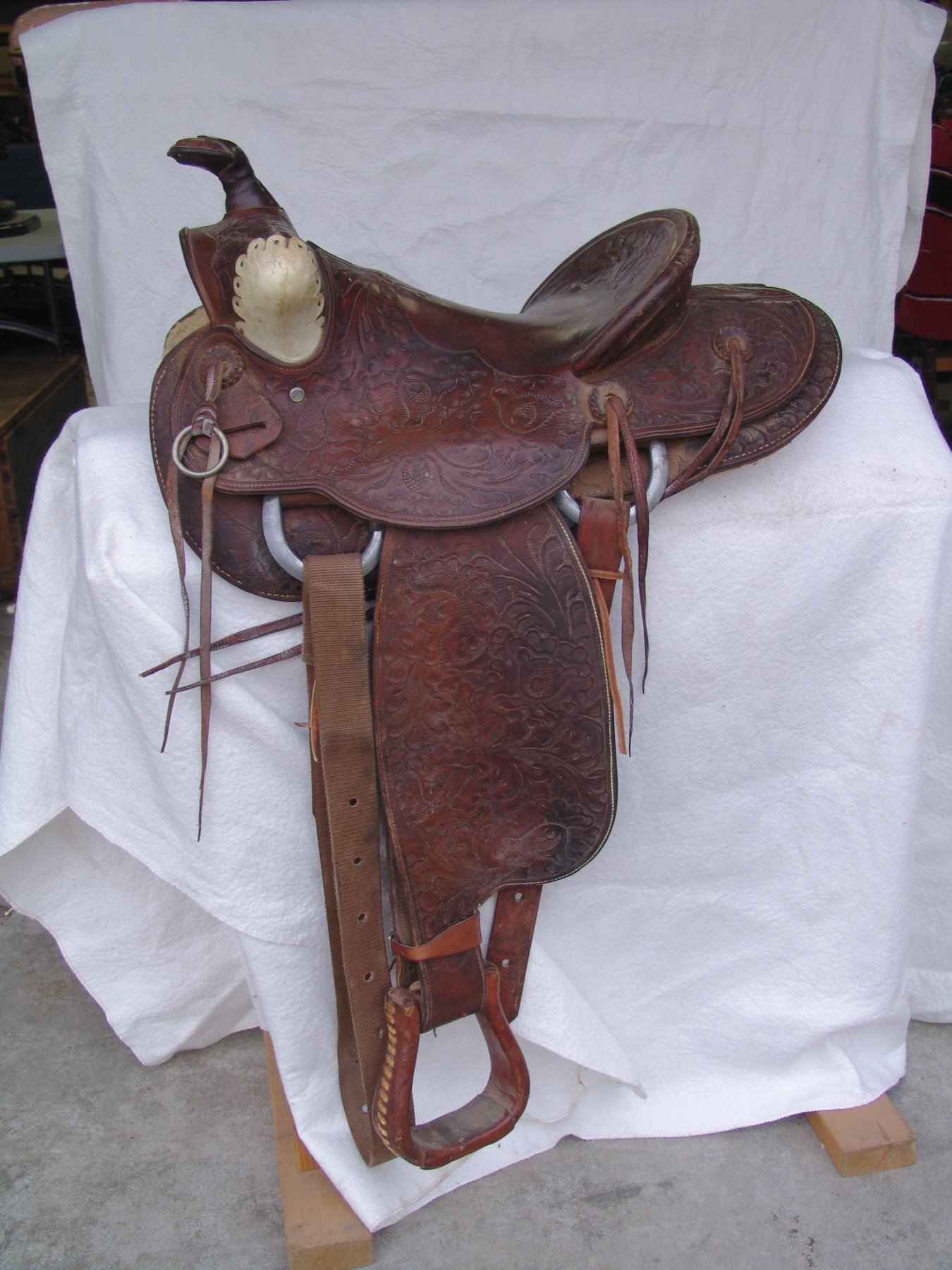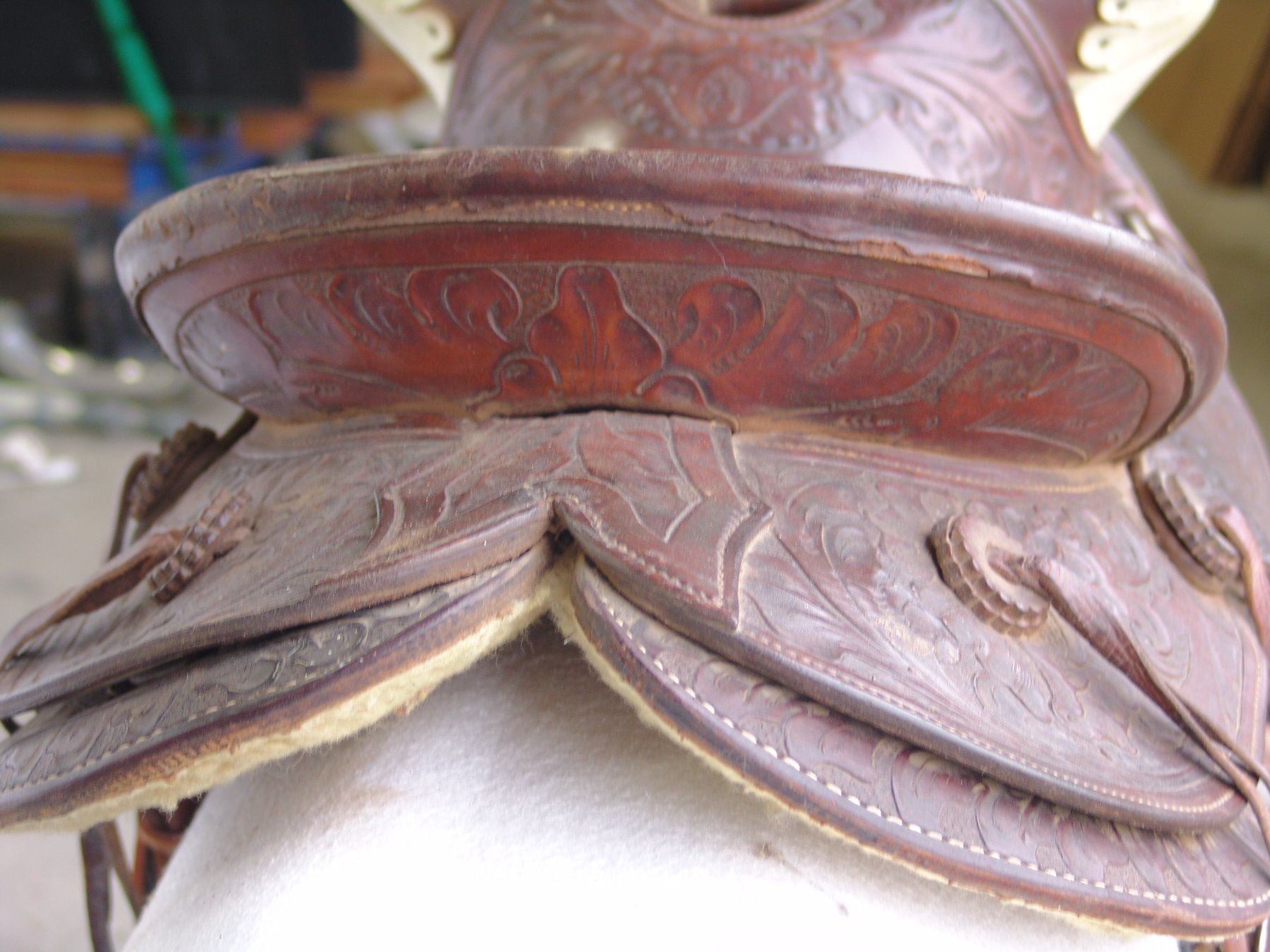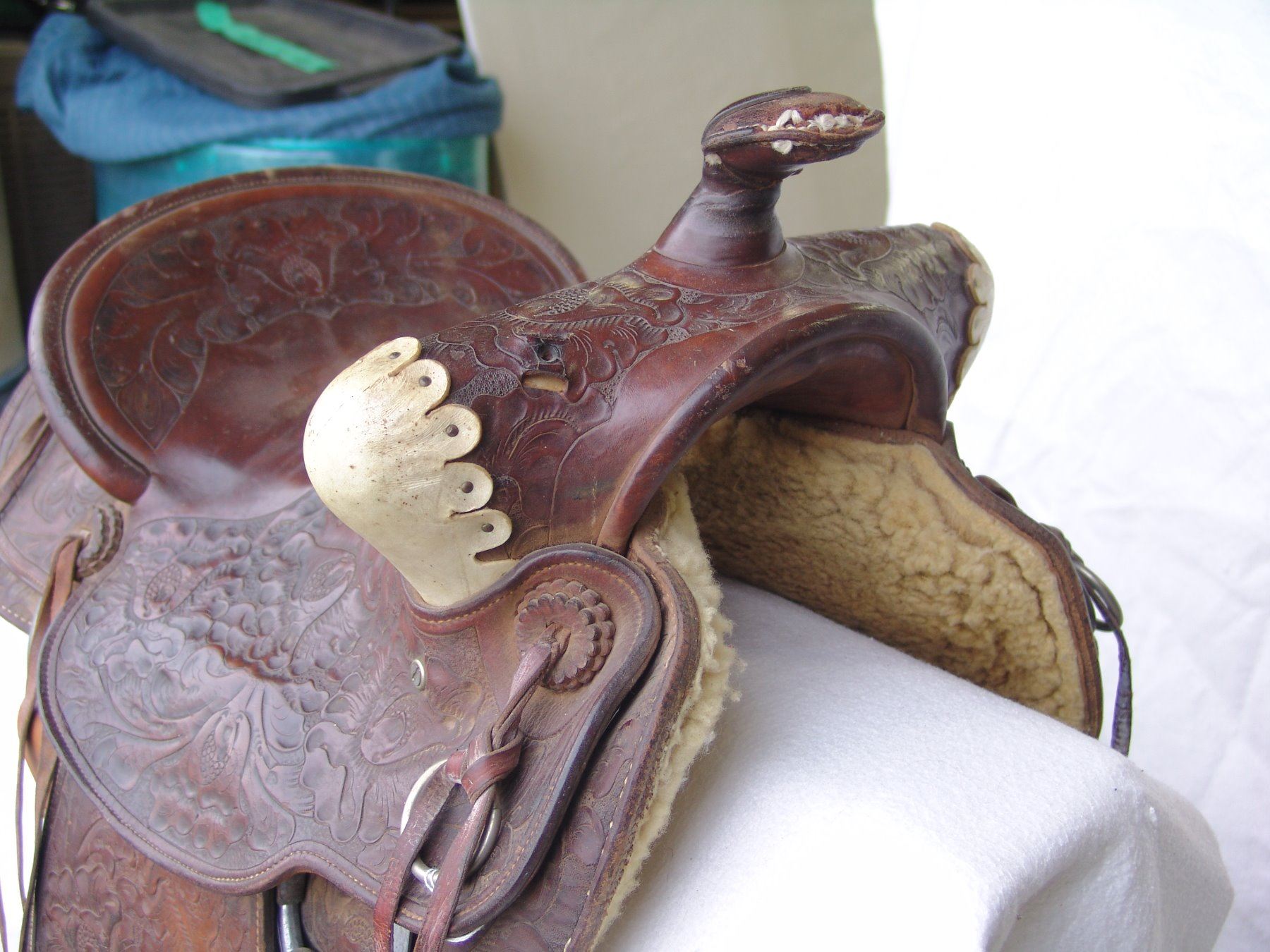 Mid 1900s Adult Vintage, fancy, fully tooled western saddle marked "Tex Tan Brahma Brand - 101+", with 14" seat. Good condition, torn out rope strap, needs oiled.