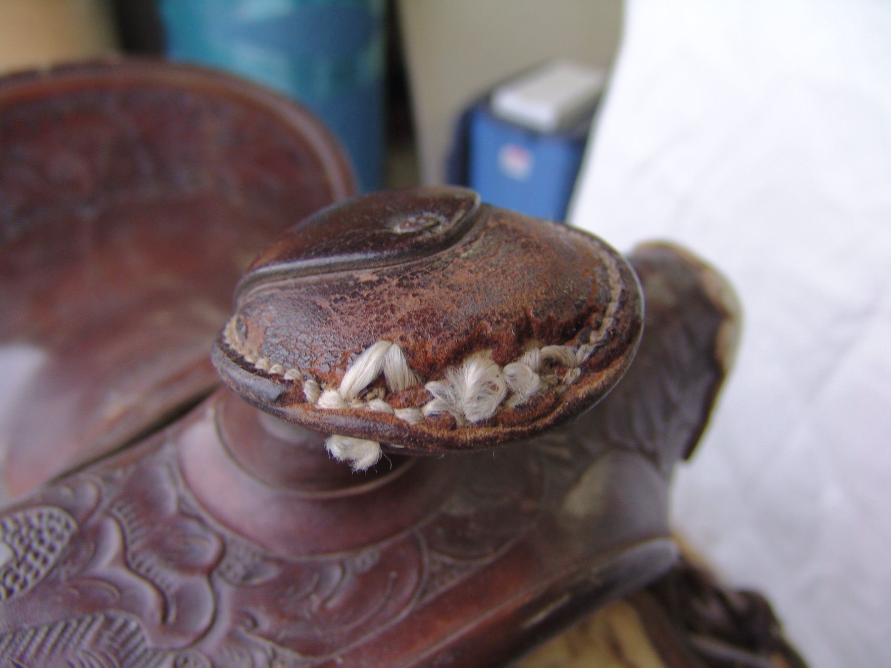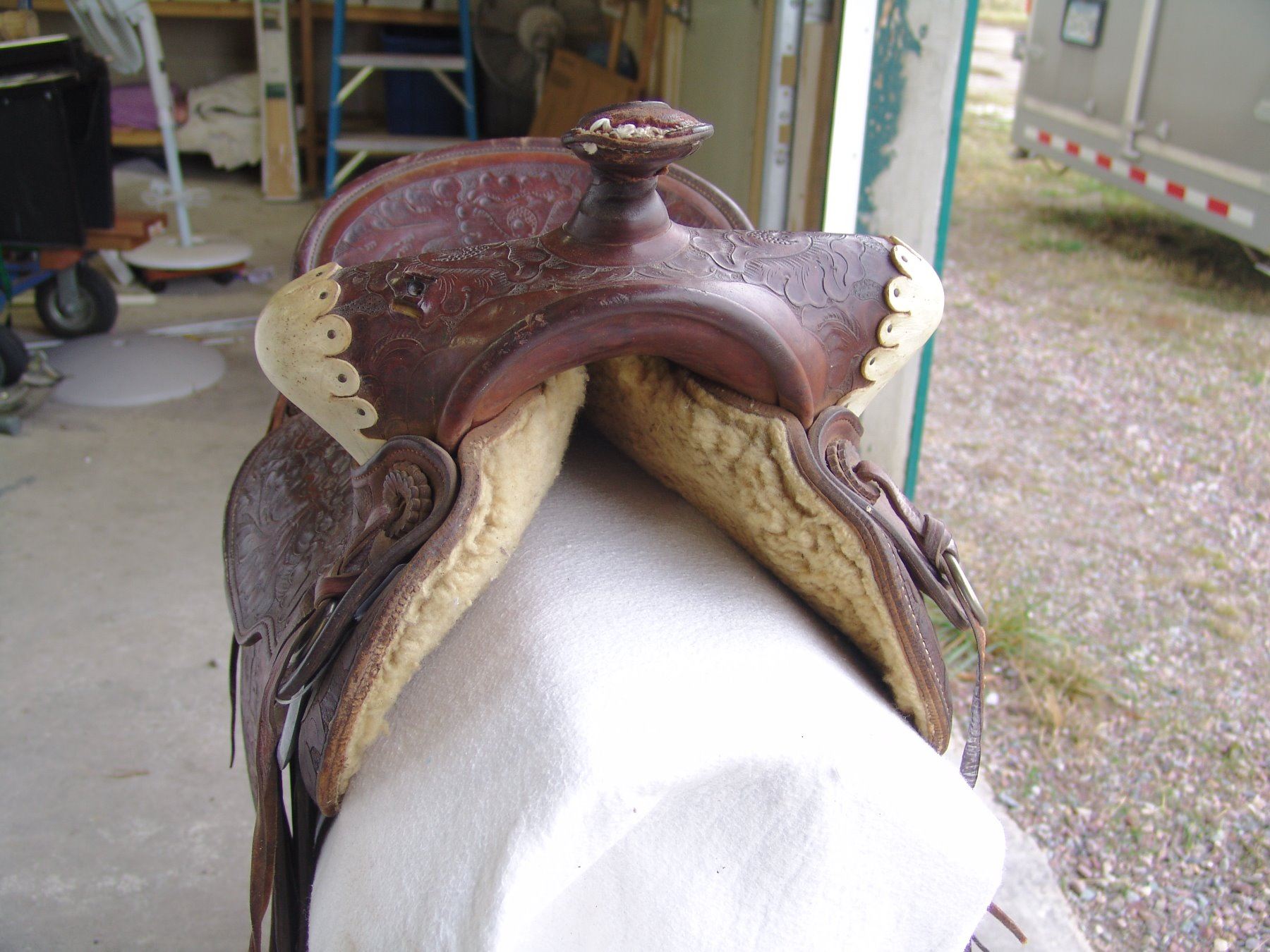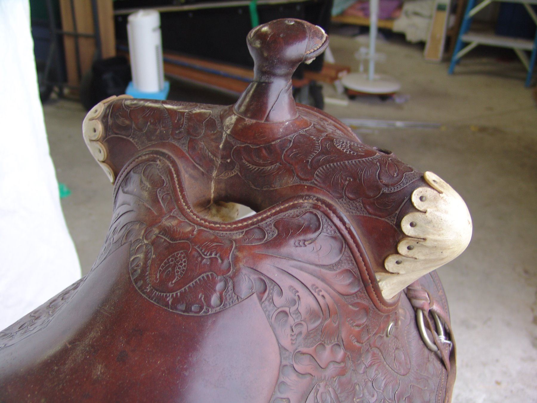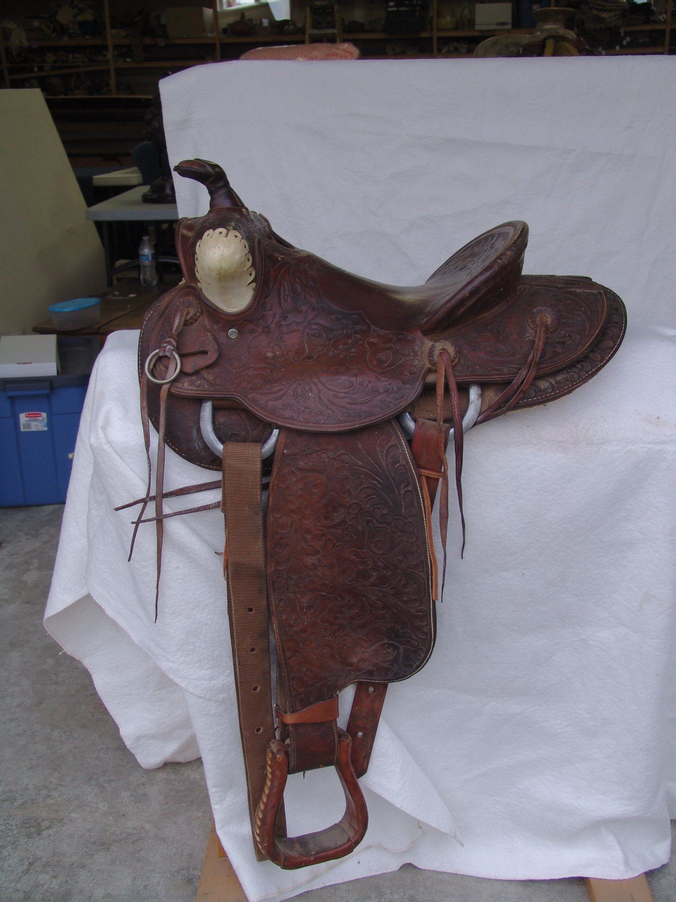 Mid 1900s Adult Vintage, fancy, fully tooled western saddle marked "Tex Tan Brahma Brand - 101+", with 14" seat. Good condition, torn out rope strap, needs oiled.