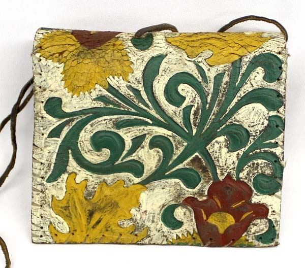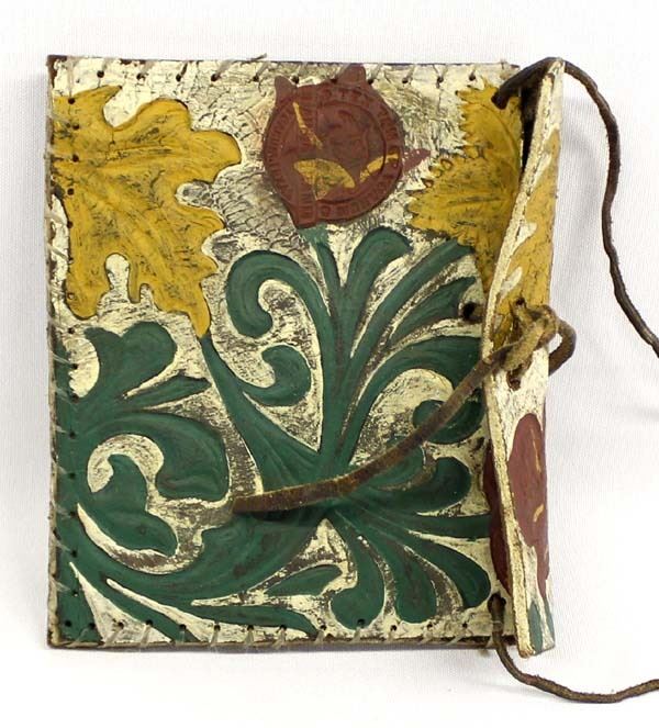 Tex Tan of Yoakum Texas Brahma Brand Leather Pouch, hand painted leaf embellishments, leather strap, measures 7'' x 6'', stamped with hallmark