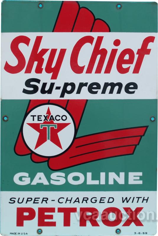 Texaco Gasoline Porcelain Sign, "Sky Chief Su-Preme, Super-Charged With Petrox" in good condition - 12" x 18"