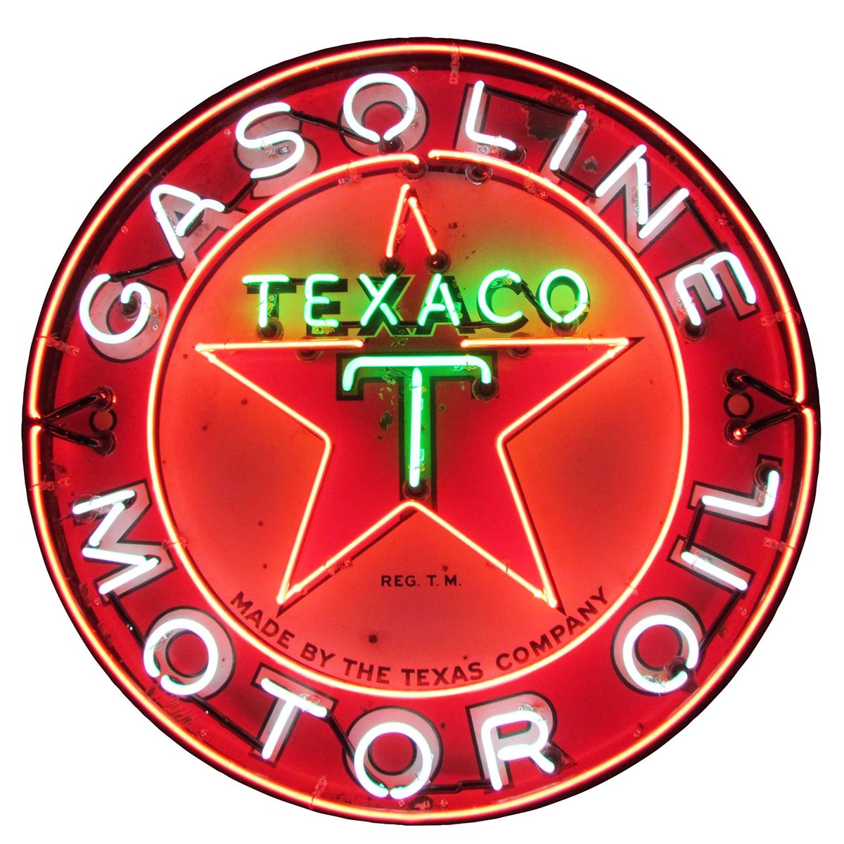 Texaco Neon Sign. This is one of the most dynamic colored neon signs out there. It would be a great addition to anyones collection. Some Small chips to the porcelain otherwise very good working condition. 42 inch diameter.