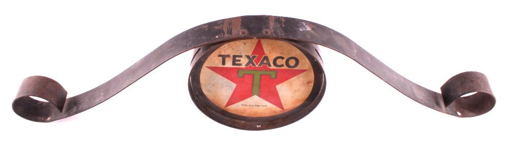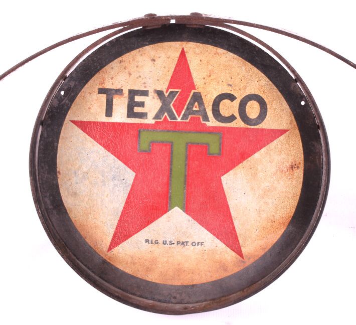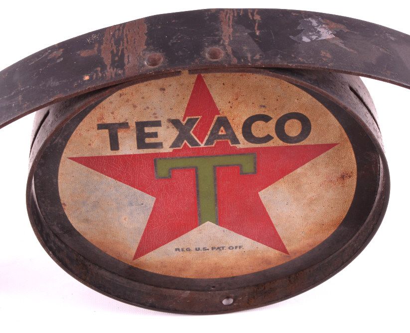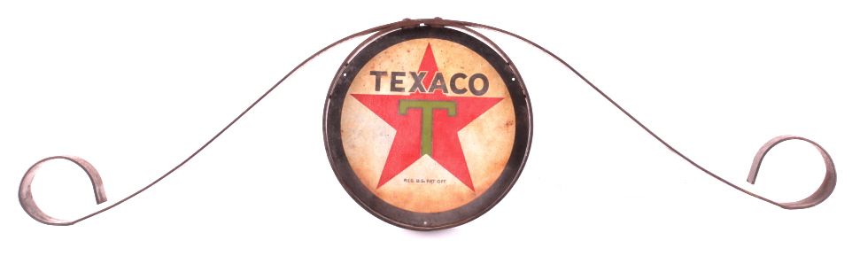 This is an original Texaco service station sign. The Texaco sign is set in a fancy steel frame. Holes in the bottom of the frame indicate this sign was mounted atop another sign or pole. The Texaco sign and frame are in very good condition. The sign measures 9.5" x 36".