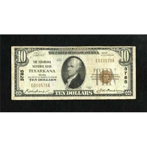 <B>Texarkana, TX</B></I> - $10 1929 Ty. 1 <B>The Texarkana NB</B></I> Ch. # 3785<BR> A pleasing bright example that retains a bit of crispness. <B>Very Fine</B></I>.<BR><I>From The Rolling Plains Collection</B></I><BR><BR><b>Shipping:</b> Coins & Currency (<a target="_blank" href="http://www.heritageauctions.com/common/shipping.php">view shipping information</a>)