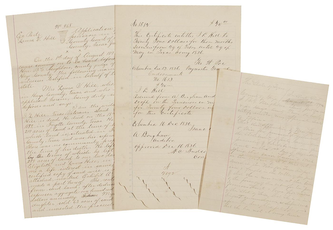 Lot of three manuscript documents, various formats and lengths, 1892. According to the documents, one “J. L. Hill, Texas Veteran” fought in the Texas Army from February to May 1836, and died on July 18, 1889. The present documents relate to the attempts of Hill’s indigent widow to obtain title to the assets her husband owned upon his death. In fine condition, with light toning, folds, and usual mild document wear. Intriguing possibilities for further research.